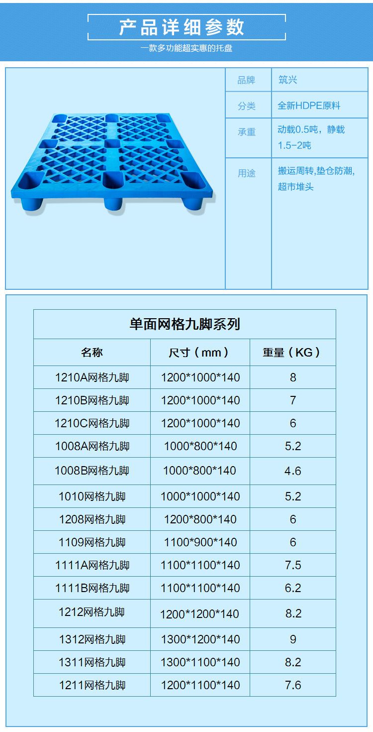 九腳托盤 田字托盤 川字托盤 雙面托盤 吹塑托盤 印刷托盤 規格較多。
